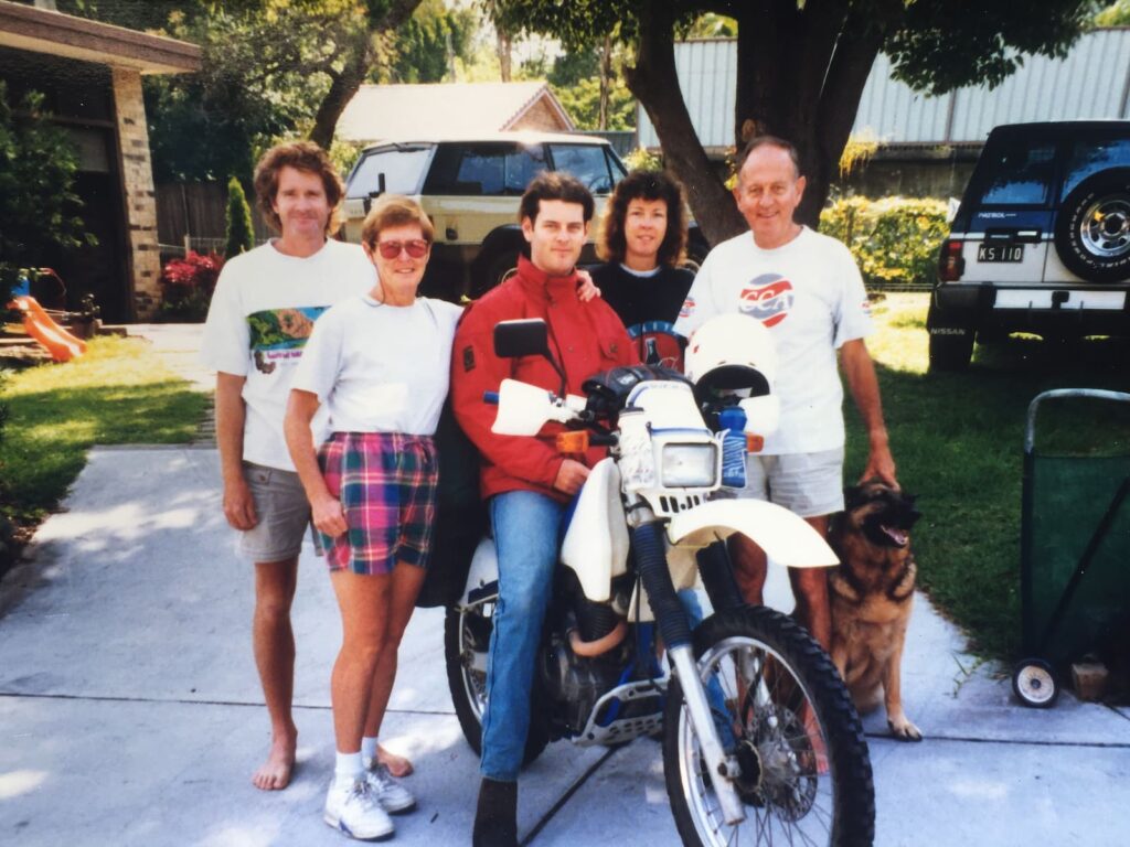 A classic ‘hit the road and see what happens’ moment. It’s 1996, and I’m on my DR250 motorbike, packed up with camping gear and a few clothes. My parents, Kevin and Barb, sister Karen and brother-in-law Brett are seeing me off (and Tahlia, the family dog). Picture: Gary Stewart.