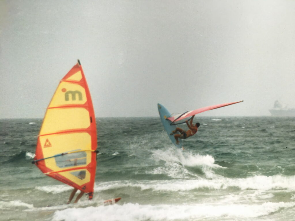 Windsurfing at Long Reef Beach in Sydney — a fabulous place to sail. It’s about 1985 and I’m the one with the pink sail getting a little air. Picture: Barb Stewart.