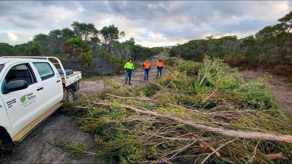 Controlling an infestation of Victorian tea tree in a Bremer Bay public reserve, 2025. I’m working with Green Skills teammates John and Flynn for the Fitzgerald Biosphere Group. Picture: Stacey Francis.